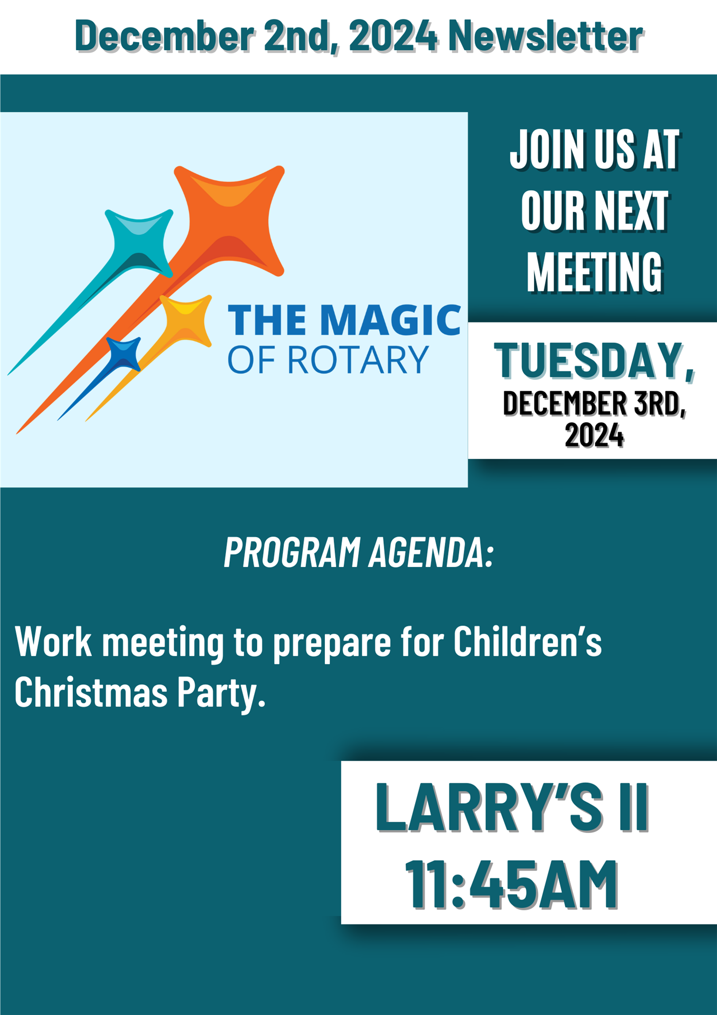 Joe O'Rourke reminded everyone to save the dates- We have our Rotary Jingle Run which will be December 7th! We do need more runners! Please spread the word! Visit: www.jinglerun.com for more information or to register for the run.