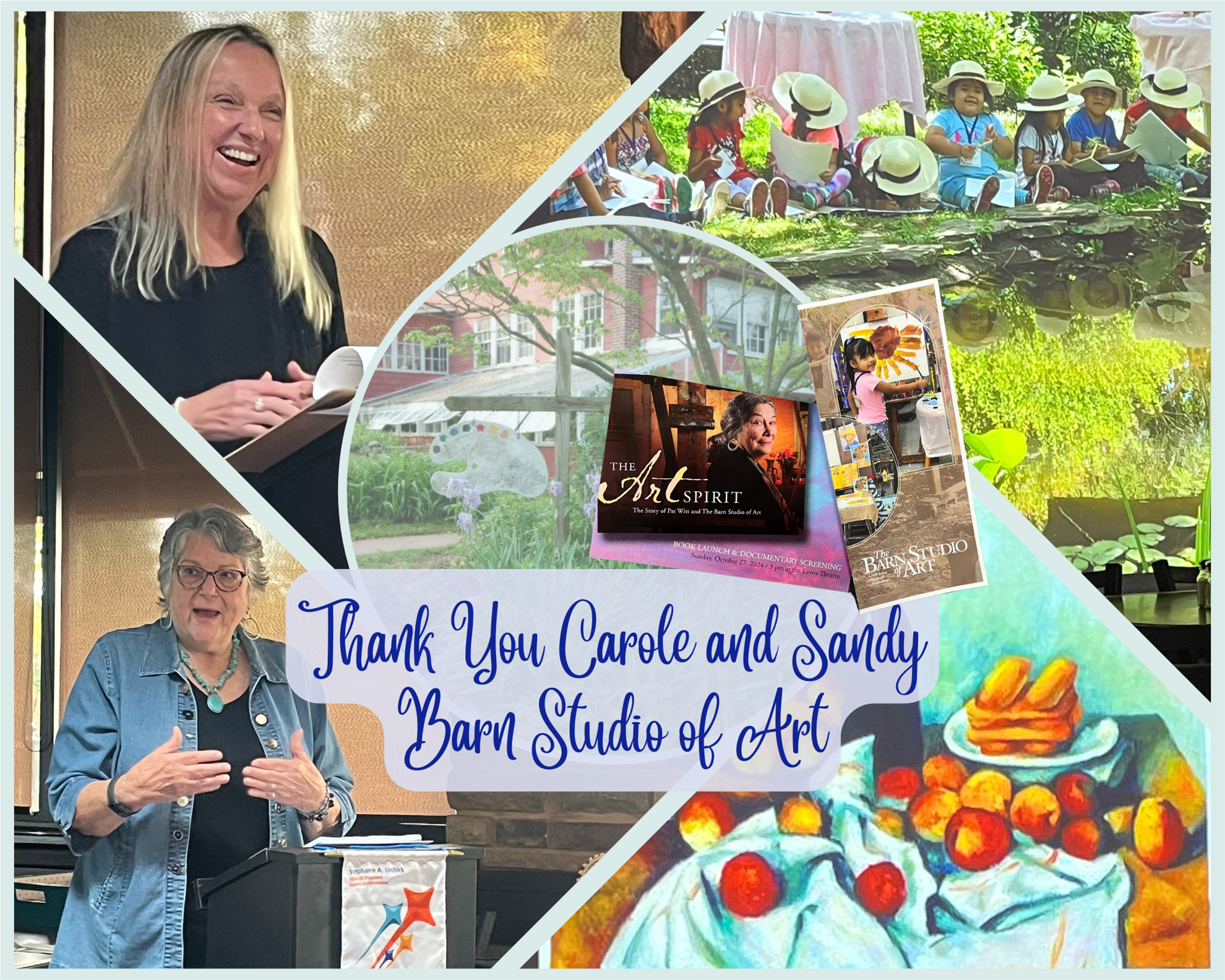 Carole is Pat Witt's daughter. Pat Witt founded The Barn Studio of Art in 1962. Through their presentation, we explored photos and artwork from various studio classes, showcasing numerous smiling children and their creative works!