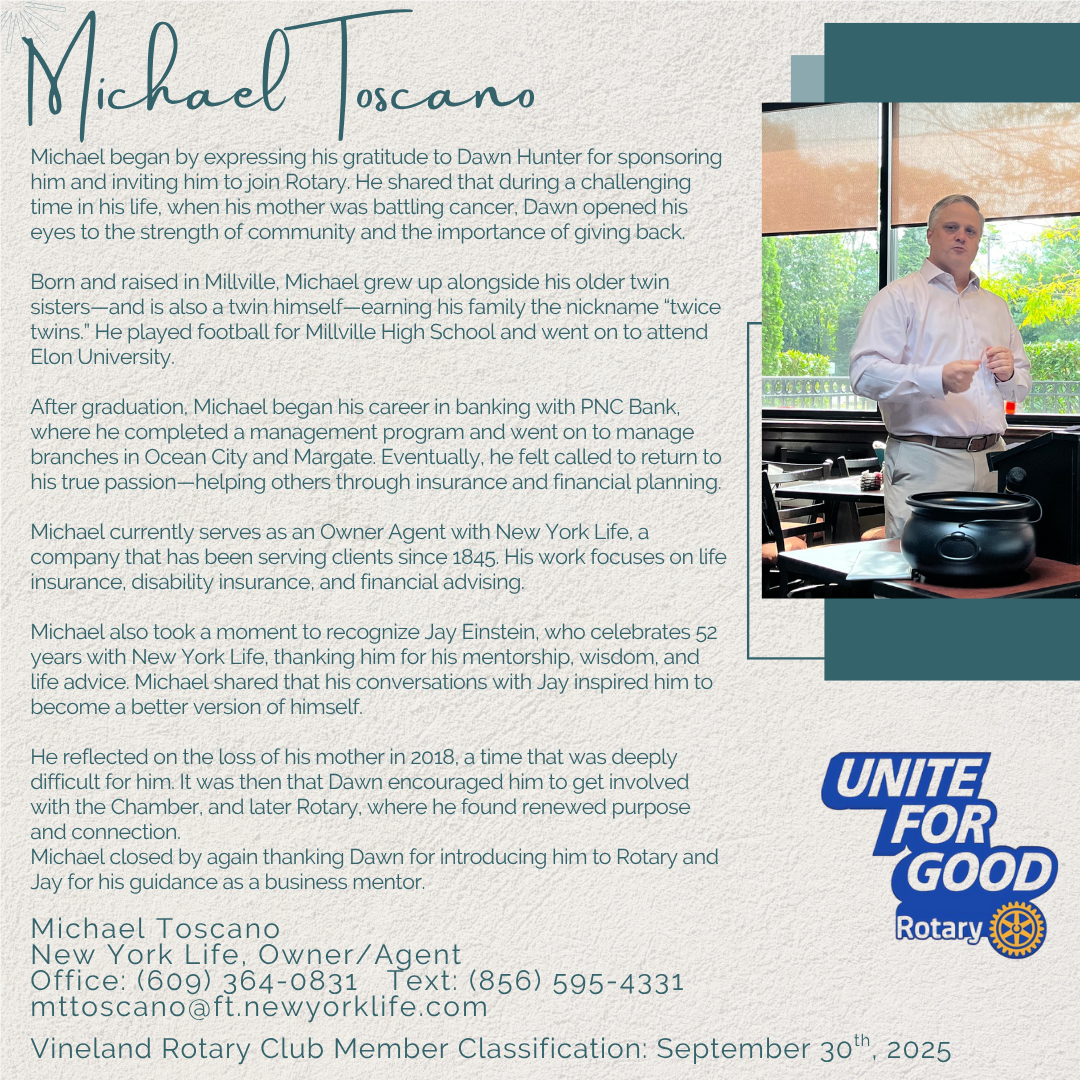 Michael is an Owner Agent with New York Life Insurance. He was inducted on 8/26/25 by Ed Morvay. Sponsor- Dawn Hunter.