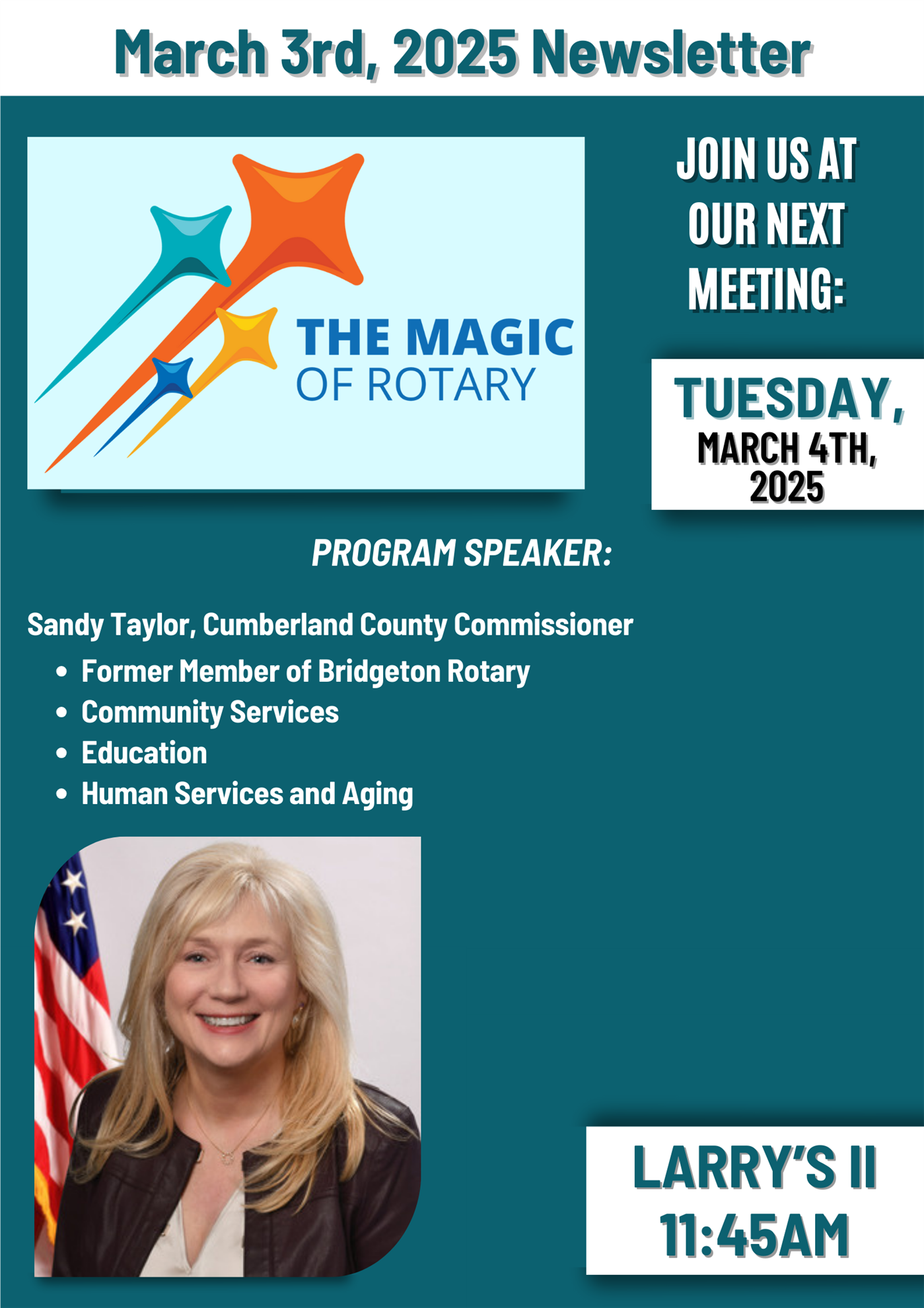 ~ Joseph (Joe) Cortez is being proposed for membership. Joe is the Executive Director of the Foundation at CompleteCare Health Network. He is a Bridgeton resident and currently a member of the Rotary Club of Bridgeton. Joe will be transferring to Vineland Rotary Club. He is scheduled to be inducted on 2/25/25 by Maureen Simmons. Sponsor- Gail Marino.